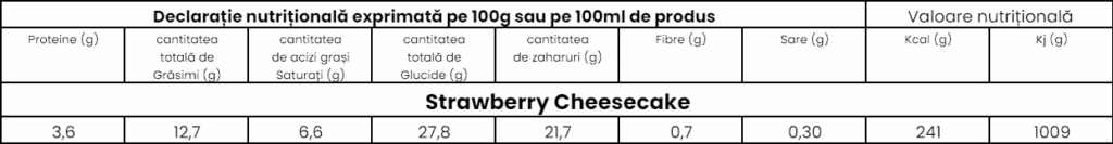 Căpșuni (22%), brânză proaspătă grasă (lapte) (20%), zahăr, apă, sirop de glucoză-fructoză, lapte integral (lapte), făină de grâu, ou întreg, ulei de rapiță, grăsime de palmier, pudră de zer dulce (lapte), amidon modificat, lactoză (lapte), amidon de GRÂU, gelatină, amidon de cartof, lapte praf degresat, sare, acidifiant (E330), agenți de îngroșare (E412, E401), agenți de creștere (E450, E500), dextroză, agent de gelifiere (E440), arome naturale, umectant (E420), emulgatori (E471, E322), sirop de glucoză, stabilizator (E516), proteină din lapte, regulatori de aciditate (E332, E331, E300), coloranți alimentari din surse naturale (suc concentrat de morcov negru, suc concentrat de vișine, extract de șofrănel, extract de morcov, extract de dovleac). Poate conține: fructe cu coajă, arahide și soia. Produsul conține cereale, ouă și lapte, și poate conține urme de arahide, soia și nuci.